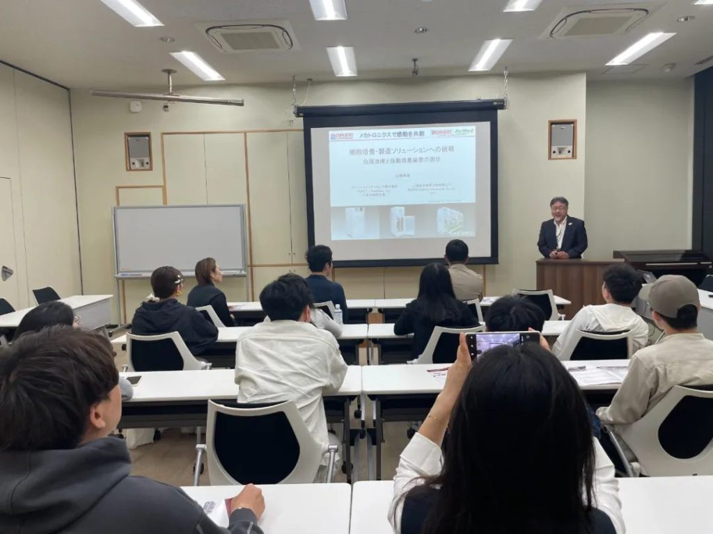 行程首站聚焦生命科技前沿。交流團專程造訪位於茨城縣筑波市的RORZE Lifescience Inc.。該公司致力於推動藥物研發、iPS細胞研究及再生醫學領域發展,目標成為日本新興產業發展的支柱並提升人類生活品質。青年們認真聆聽了總裁兼首席執行官山崎幸登先生關於公司使命與技術創新的演講,與其深度交流,並實地參觀了多台運行中的先進自動化設備,對日本在再生醫療工程化領域的領先地位有了直觀認識。